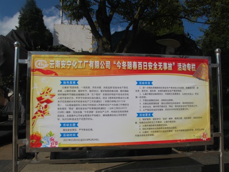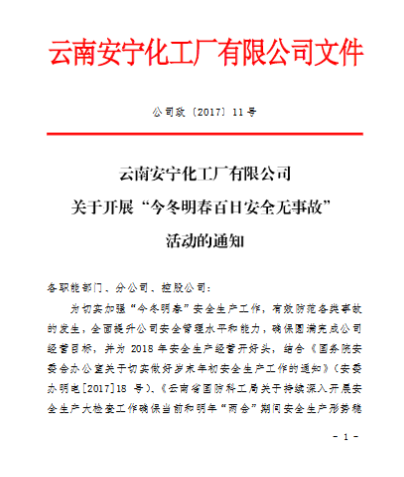 2017年11月21日公司制訂下發(fā)了《云南安寧化工廠(chǎng)有限公司關(guān)于開(kāi)展“今冬明春百日安全無(wú)事故”活動(dòng)的通知》(公司政[2017]11號(hào)),明確了活動(dòng)主題、活動(dòng)時(shí)間、活動(dòng)內(nèi)容和活動(dòng)要求。