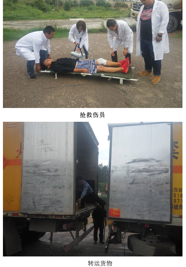 2018年6月22日14時(shí),云南安化中達(dá)物流有限責(zé)任公司組織開展以汛期雨季為專題的“安全生產(chǎn)月”應(yīng)急救援。整個(gè)演練以雨季彎道行駛致車輛側(cè)滑并與行人發(fā)生擦掛為背景,模擬發(fā)生人員傷害、車輛失控、貨物倒運(yùn)等環(huán)節(jié)展開的應(yīng)急救援。