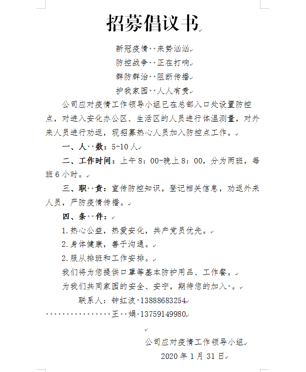 1月31日,公司應(yīng)對(duì)疫情工作領(lǐng)導(dǎo)小組在總部發(fā)出《招募倡議書》,增援防控點(diǎn)。截止當(dāng)天17點(diǎn),總部可艷潔、殷宏、趙舒婭、周韋凡、李雁雄、余 虎、張艷梅、李曉江、楊美萍踴躍報(bào)名。