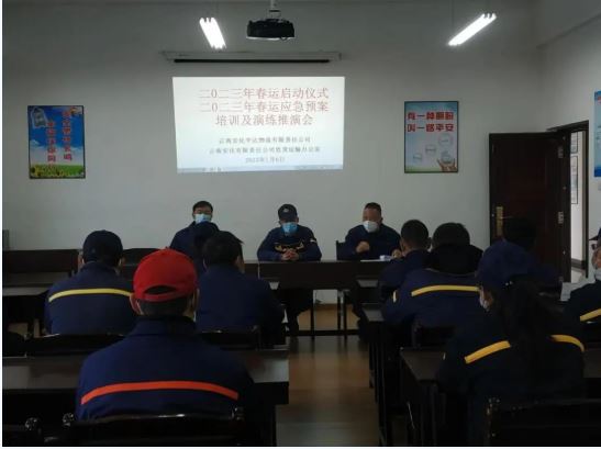 演練開始前,中達(dá)物流公司總經(jīng)理張睿、副總經(jīng)理張金元、安化公司危爆辦主任王現(xiàn)平組織參演人員在中達(dá)會議室進(jìn)行2023年春運啟動儀式、春運應(yīng)急預(yù)案培訓(xùn)及演練。