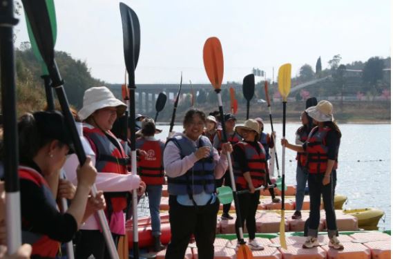 隨后,在教官的指導(dǎo)下,女職工們開展了破冰行動(dòng)、飛盤團(tuán)建、團(tuán)隊(duì)密碼、乘風(fēng)破浪等系列拓展活動(dòng)。其中乘風(fēng)破浪項(xiàng)目把女職工們參與活動(dòng)的熱情推到了高潮,此項(xiàng)活動(dòng)具備了常規(guī)團(tuán)建的緊張刺激,又帶有水上活動(dòng)特有的娛樂性,在水天一色間,全員釋放激情,拼搏向前。